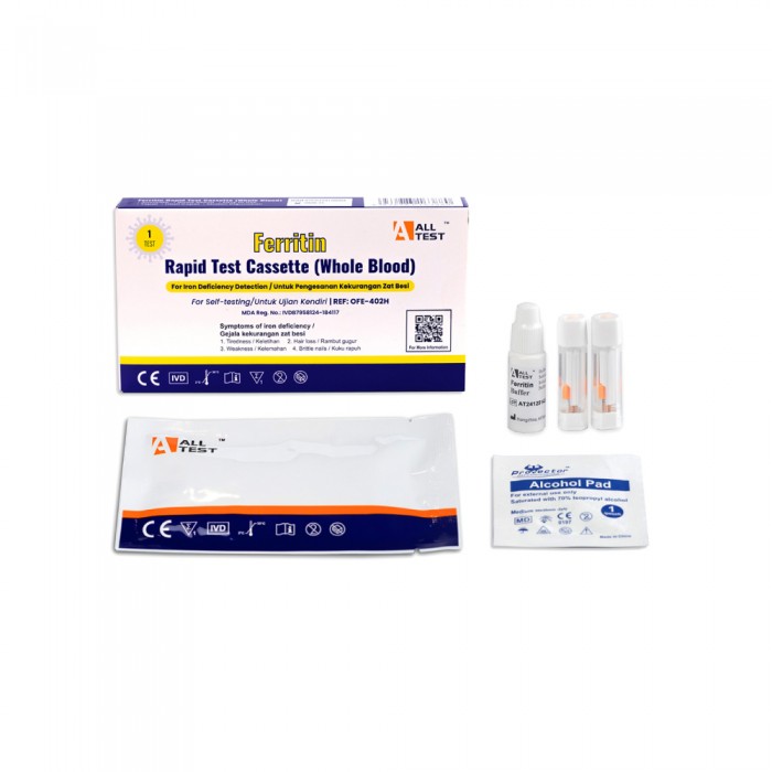 The ALLTEST Ferritin Rapid Test Cassette is an easy-to-use home screening test designed to detect ferritin levels, the key indicator of your body's iron storage. This 1-test kit is ideal for those who want to check for iron deficiency or anemia conveniently and privately, without the need for a lab visit.