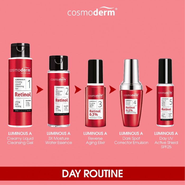 Cosmoderm Luminous A Day UV Active Shield SPF25 30ml is used for lifting, firming & protecting the skin from UV radiation-damages.