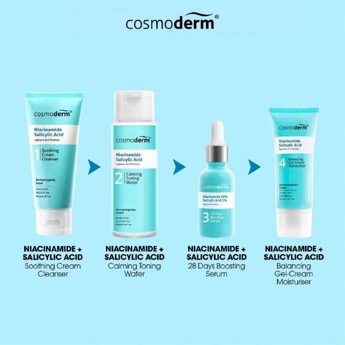 Cosmoderm Niacinamide Calming Toning Water 100ml is an all-in-one, power combination of Niacinamide and Salicylic Acid works together to give you healthier, beautiful skin that simply glows.