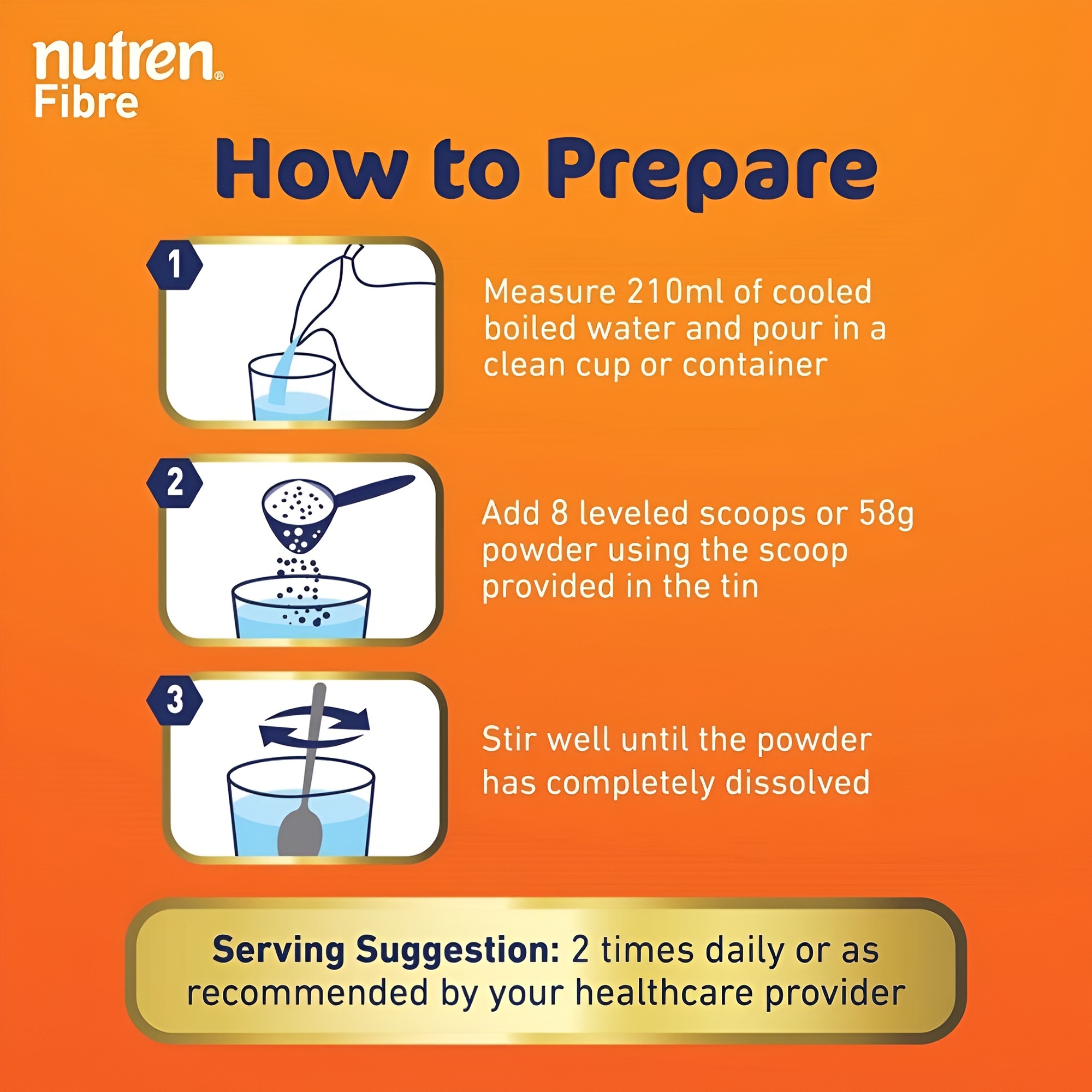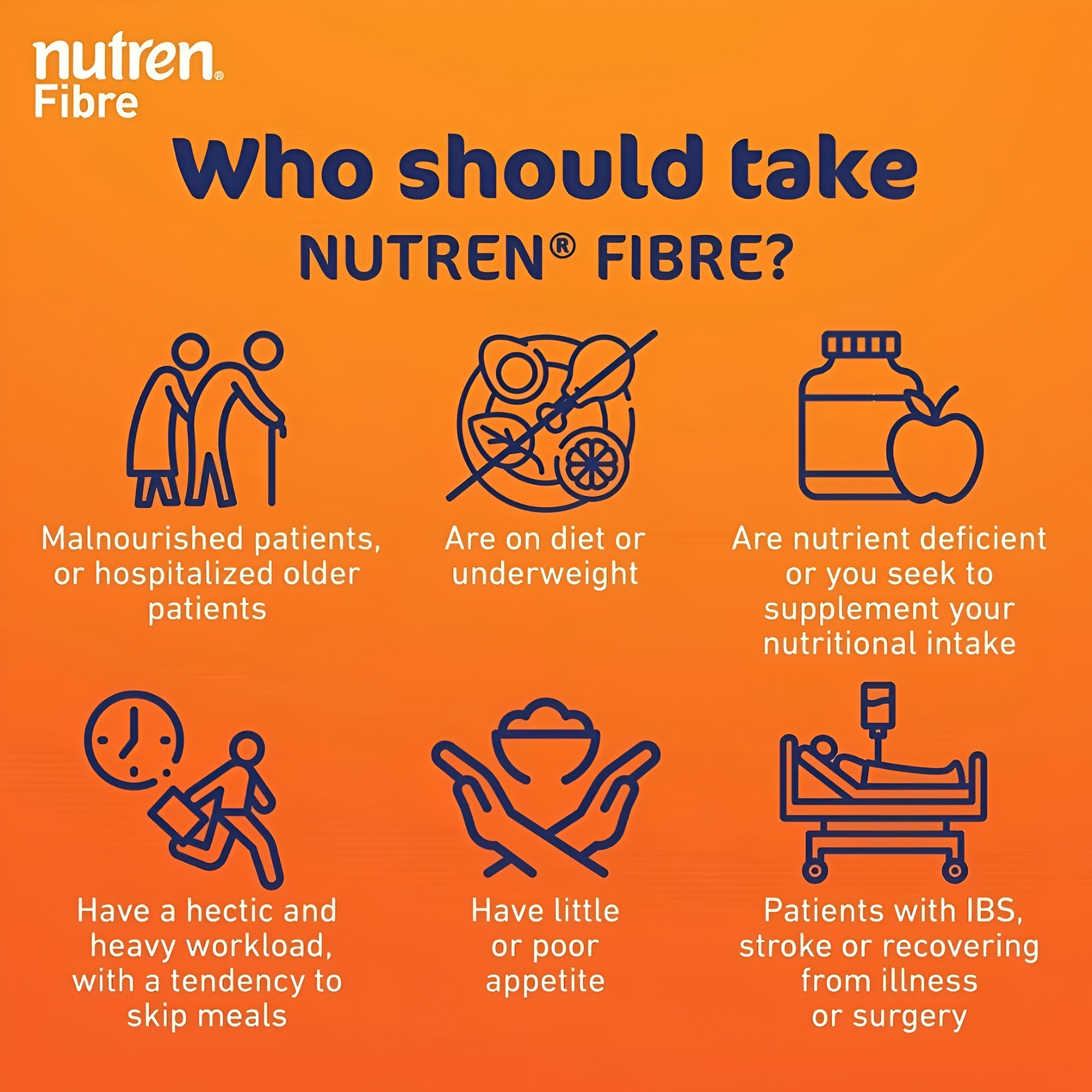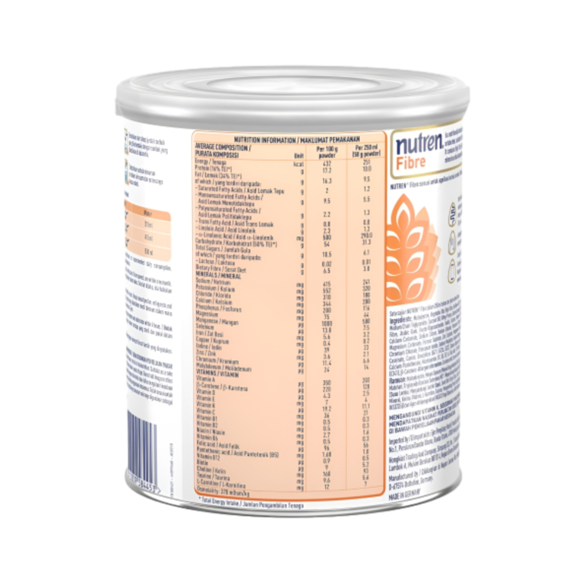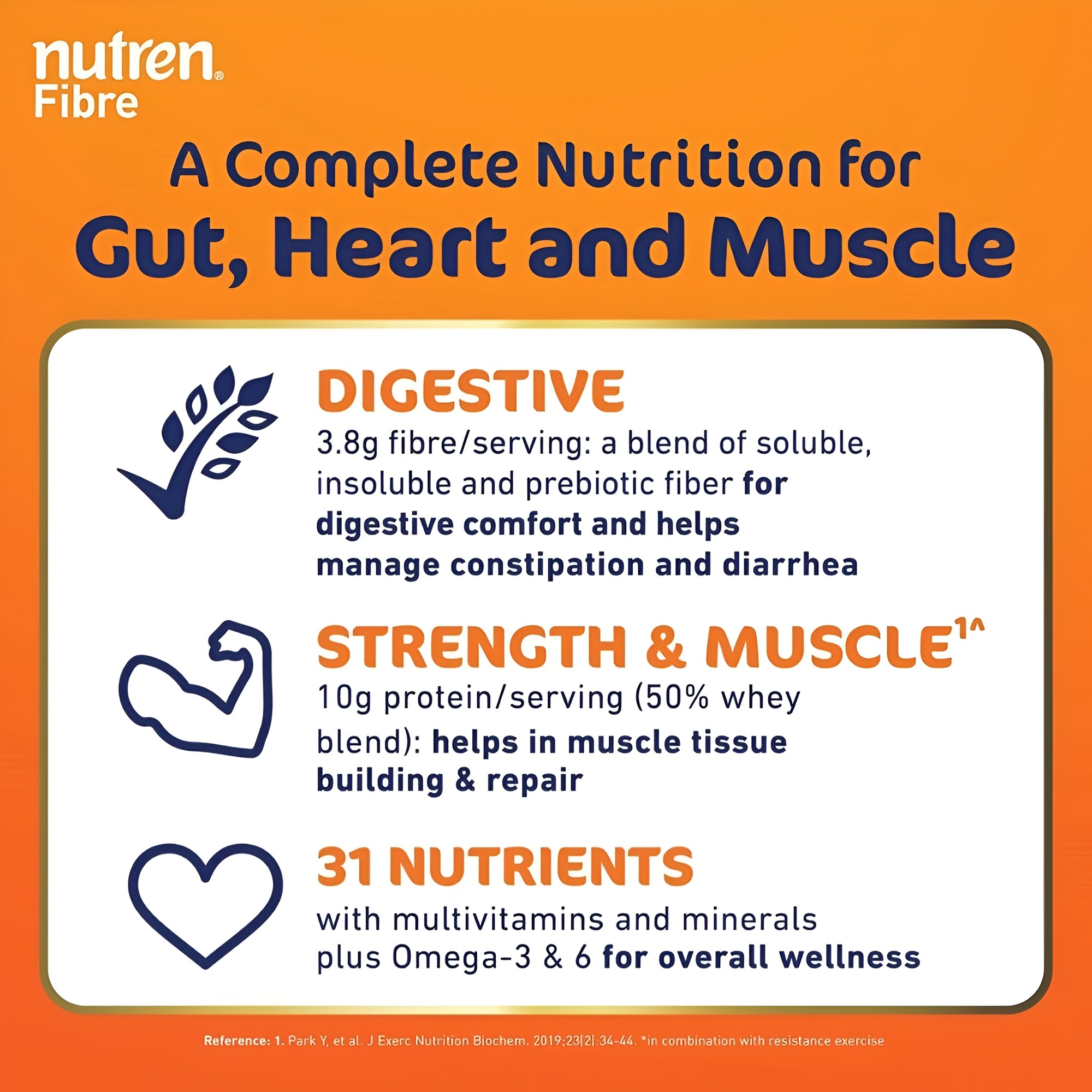NUTREN Fibre is a nutritionally complete milk powder specially formulated with added fibre to support digestive health. It provides balanced nutrition with protein, vitamins, and minerals, making it suitable for daily nourishment for adults and seniors.