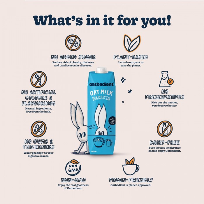 Looking for some surprises in life? Oatbedient Oat M!lk Barista is here to give you a wholesome spin! IT's so smooth and creamy with a tinge of natural sweetness from the oats, which you can enjoy on it's own or even create yummy recipes with it!