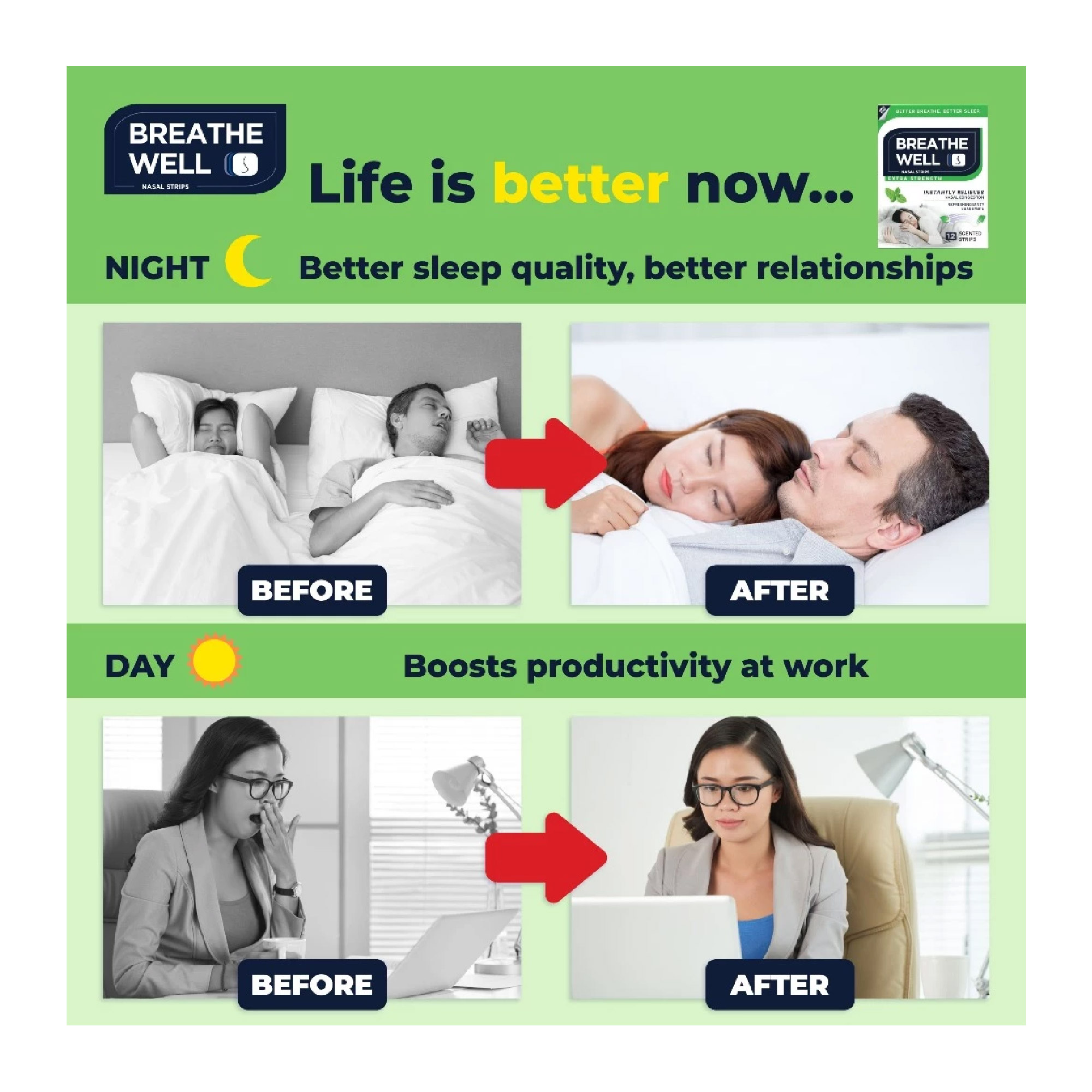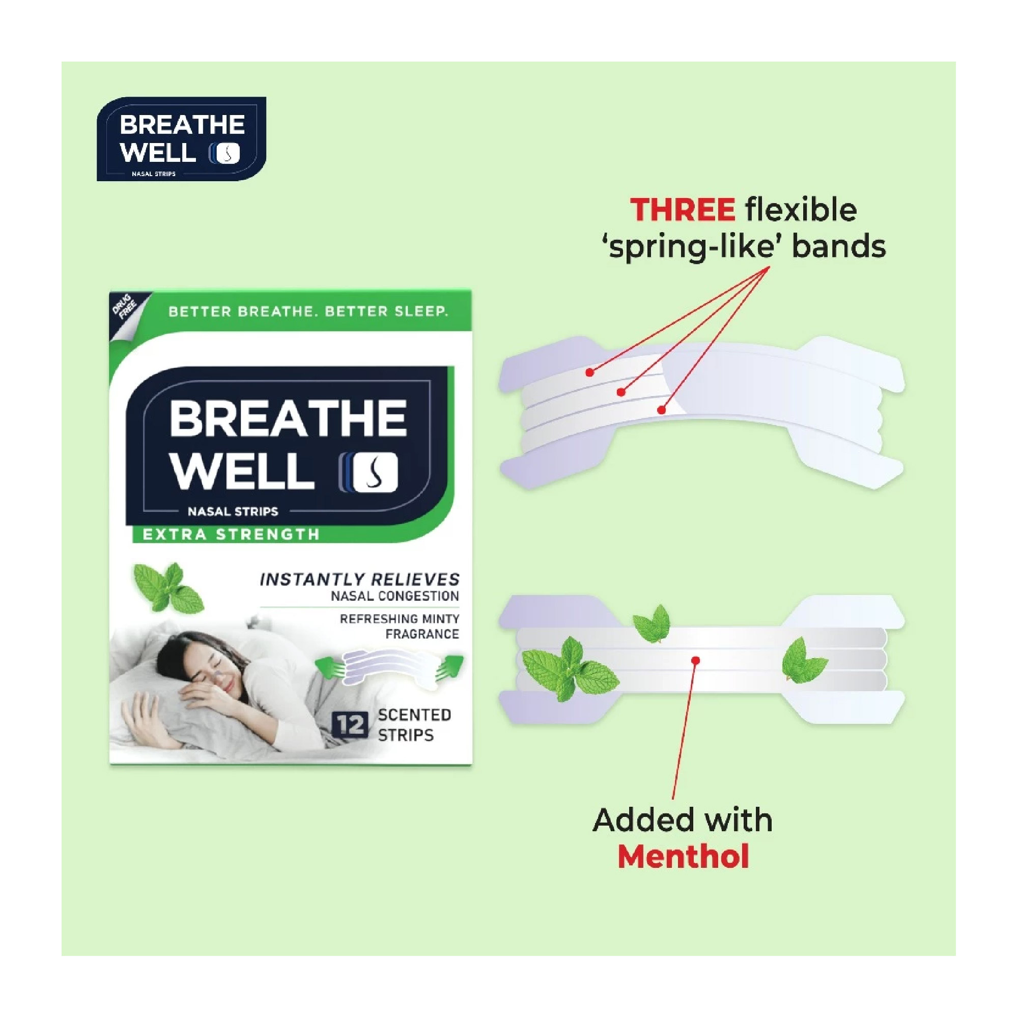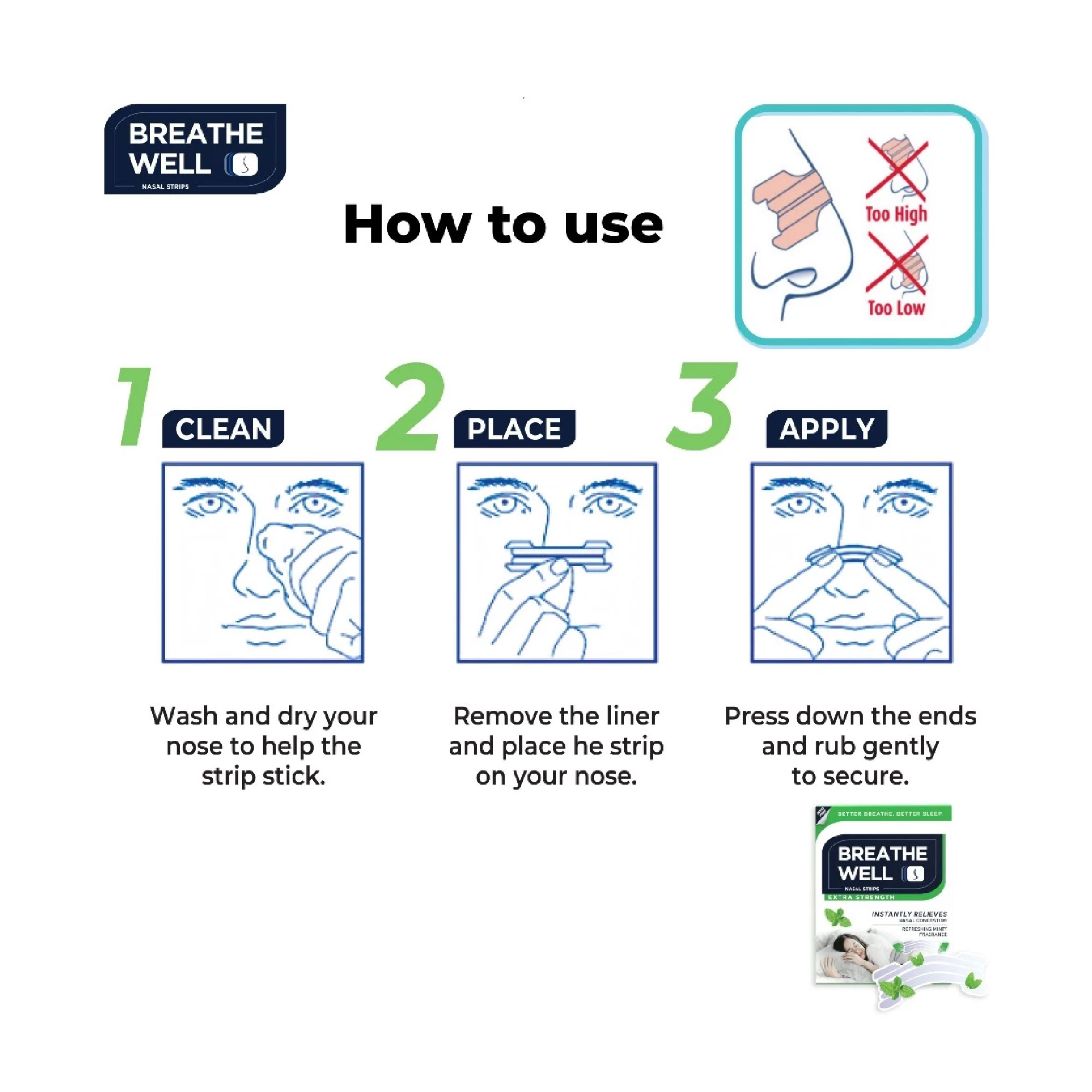 Breathe Well Nasal Strips 12’s Extra Strength are specially designed to instantly relieve nasal congestion and improve airflow for easier breathing. Made with a flexible, spring-like band that gently lifts your nasal passages, these strips help reduce snoring and allow better sleep, exercise, and daily comfort. Perfect for people with blocked noses due to colds, allergies, or deviated septum.