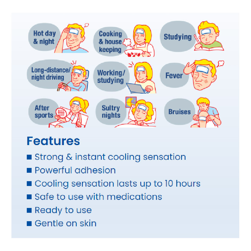 Fever, High body temperature, Headache, Toothache, Refreshing used (during hot weather and humid night), flushed skin after sports.
