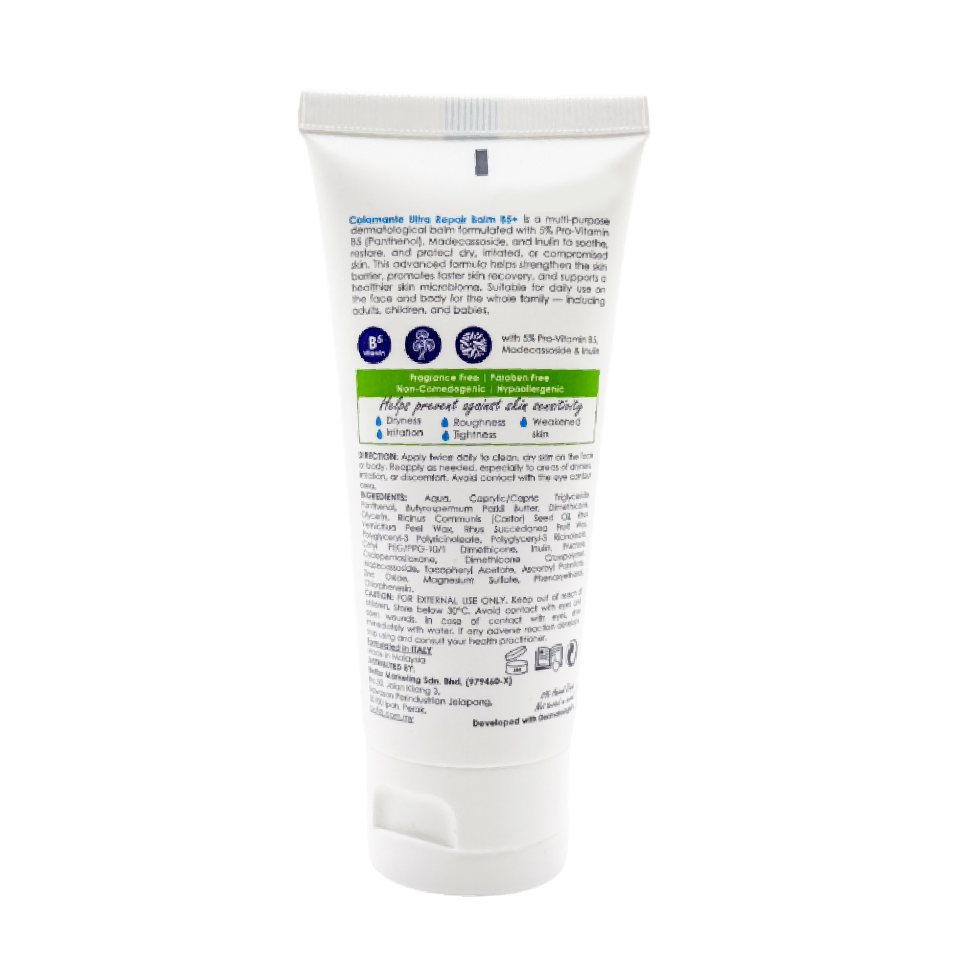Calamante Ultra Repair Balm B5+ 50ml is a soothing and repairing moisturizer enriched with Vitamin B5 and nourishing ingredients to help repair, calm, and protect sensitive or damaged skin. Its lightweight, non-greasy texture absorbs quickly to deliver deep hydration and restore the skin’s natural barrier — perfect for dry, irritated, or post-treatment skin.