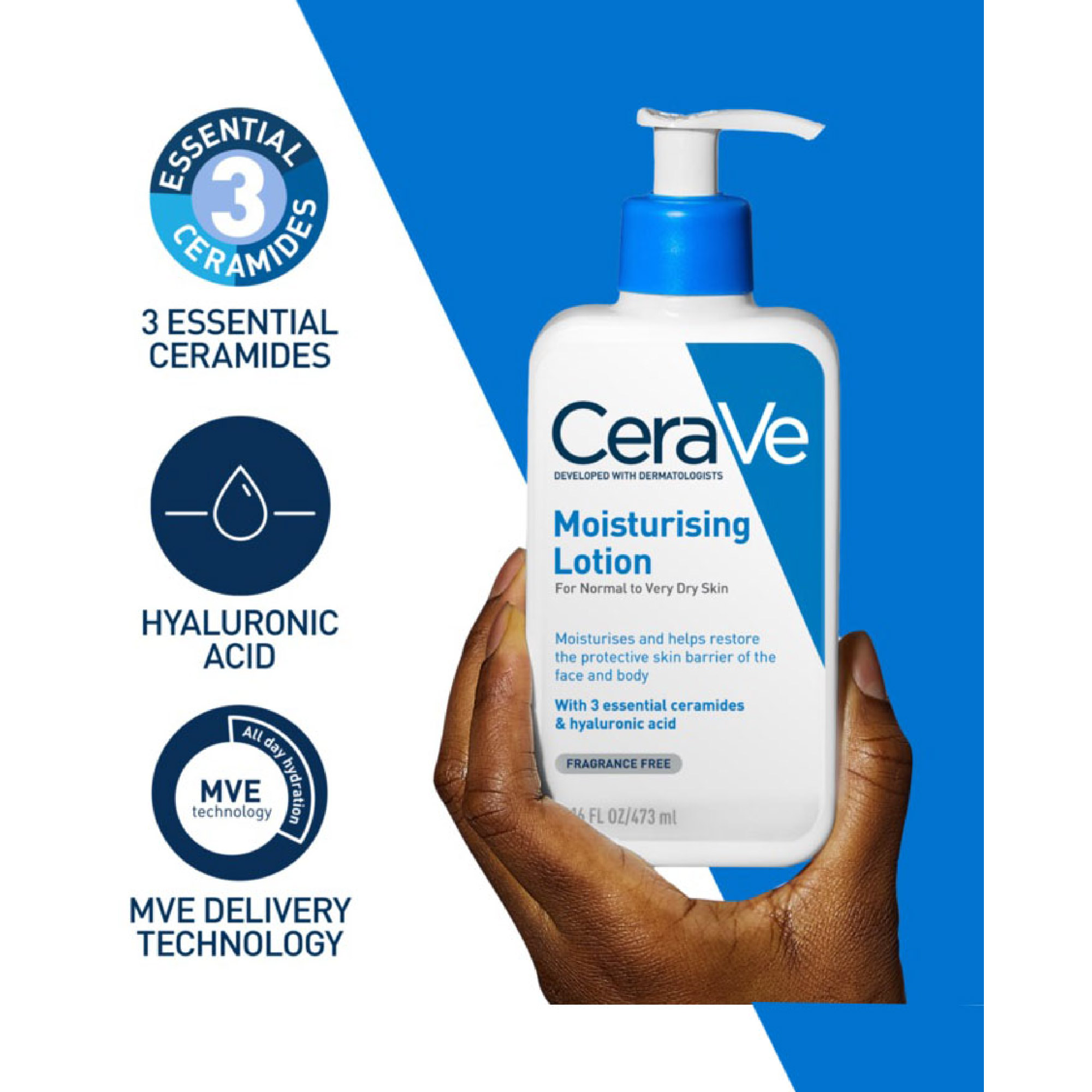 Benefits of CERAVE Daily Moisturizer Body Lotion with essential ceramide 473ml, 24-hour hydration for Normal & Dry Skin: