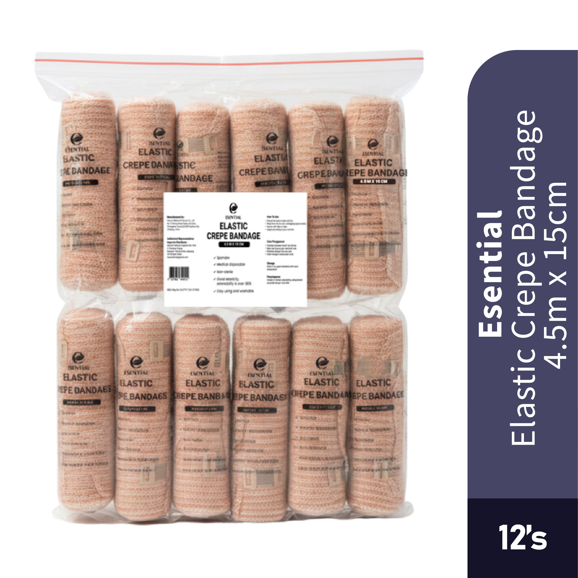 Esential Elastic Crepe Bandage is a stretchable support bandage designed for wrapping injuries, providing compression, and supporting weak or strained muscles and joints.