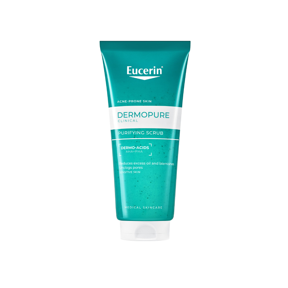 EUCERIN Dermopure Clinical Purifying Scrub 100ml – A gentle yet effective facial exfoliating scrub formulated with AHA + PHA to help unclog pores, remove dead skin cells, and improve skin texture. Suitable for oily and acne-prone skin to promote a clearer and smoother complexion.