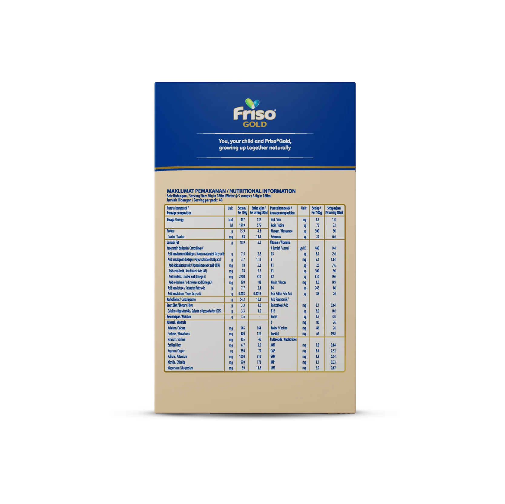 Skimmed Cow’s Milk, Demineralized Whey (from Cow’s Milk), Vegetable Oils (Palm Oil, Palm Kernel Oil, Canola Oil (Low Erucic Acid Type), Sunflower Oil, Arachidonic Acid (AA) (Single Cell Oil)), Lactose, Galacto-Oligosaccharide (GOS), Maltodextrin, Docosahexaenoic Acid (DHA) (Fish Oil), Taurine, Nucleotides (Cytidine-5′- Monophosphoric Acid, Disodium Uridine-5′-Monophosphate, Adenosine-5′- Monophosphoric Acid, Disodium Guanosine-5′-Monophosphate, Disodium Inosine-5′-Monophosphate), Bifidobacterium Animalis Subsp. Lactis HN019, Mixture of Vitamins and Minerals and Emulsifier (INS 322(i)).