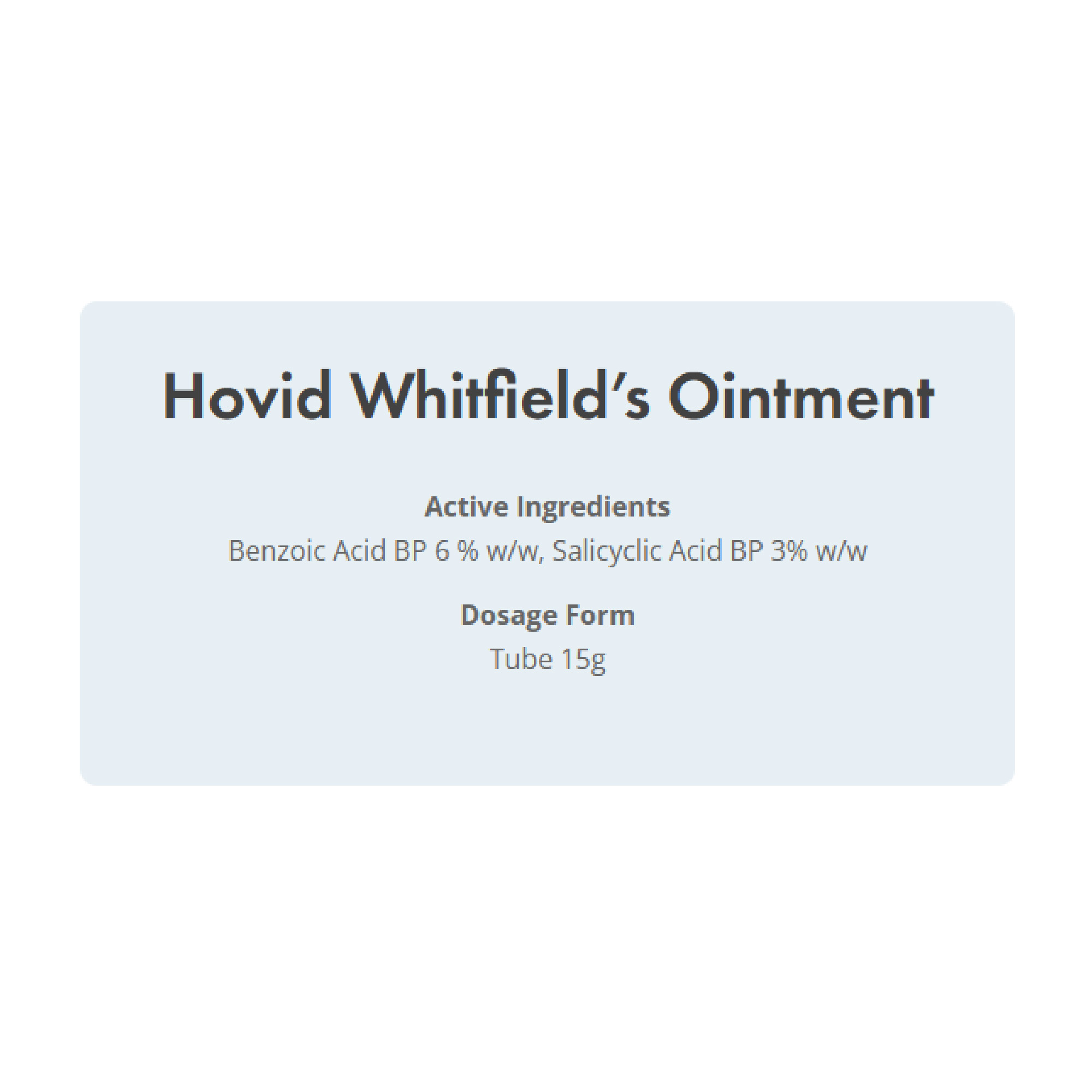 HOVID Whitfield Ointment 15g is a topical antifungal ointment used to treat fungal skin infections such as ringworm, athlete’s foot, and jock itch. It helps relieve itching, redness, and irritation while promoting healthier skin.