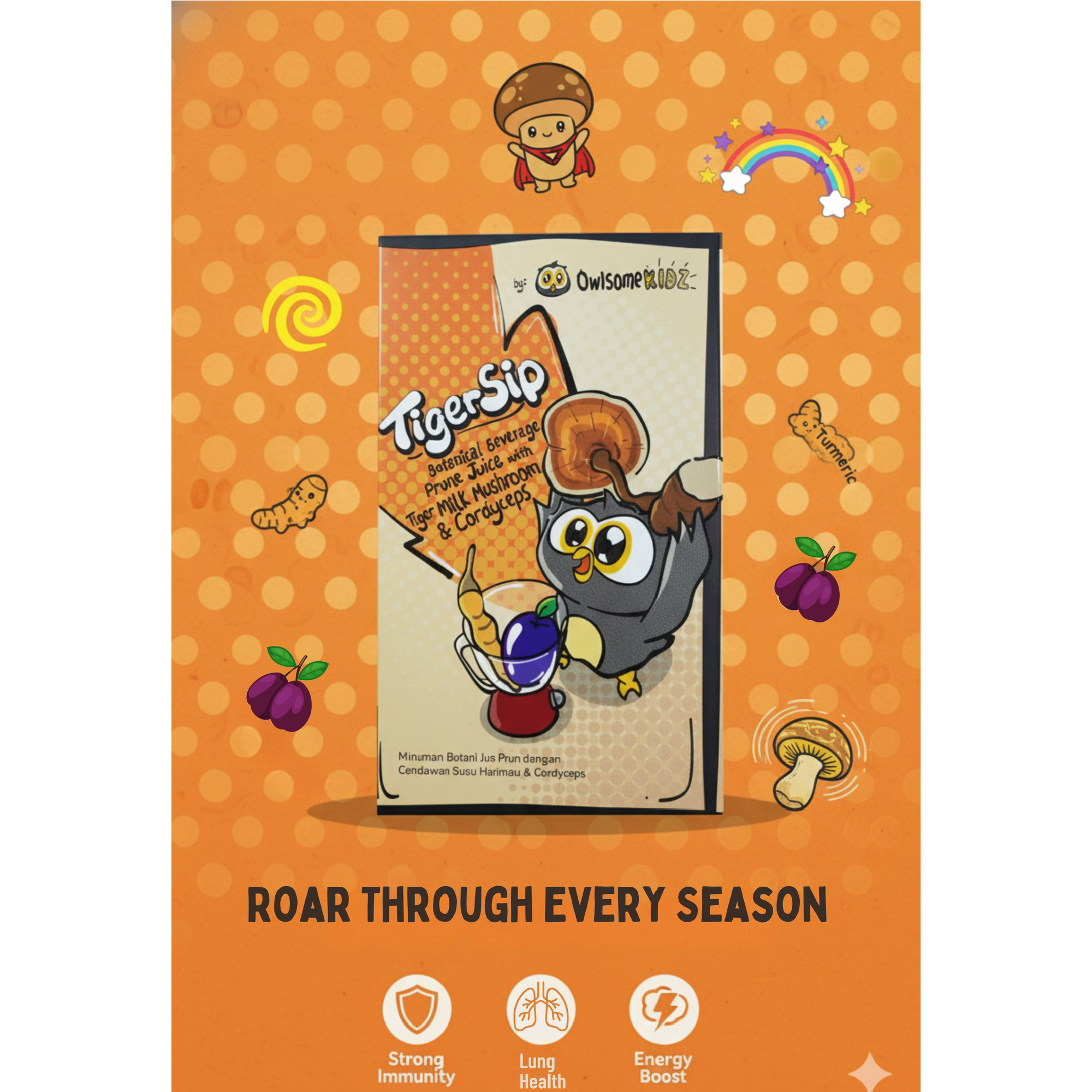 OWLSOMEKIDZ Tigersip 20's is a kids-friendly immunity booster formulated with Tiger Milk Mushroom, well-known for supporting respiratory health and strengthening the body's natural defence system. It helps reduce cough frequency, improve breathing comfort, and maintain overall wellness in growing children.