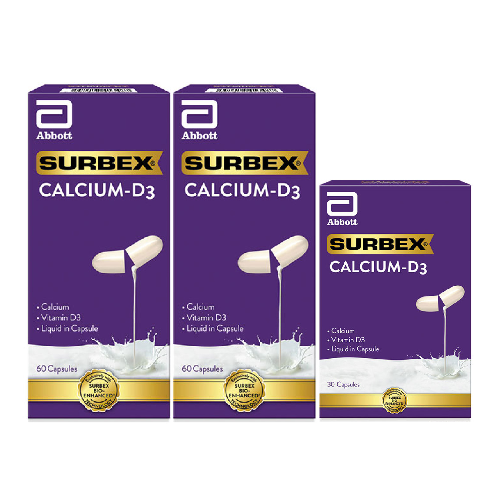 SURBEX Calcium-D3 is a daily supplement that provides essential Calcium and Vitamin D3 to support strong bones, healthy teeth, and better calcium absorption. This seasonal packing offers great value with 2 bottles of 60's plus an additional 30's, making it ideal for long-term bone health support.