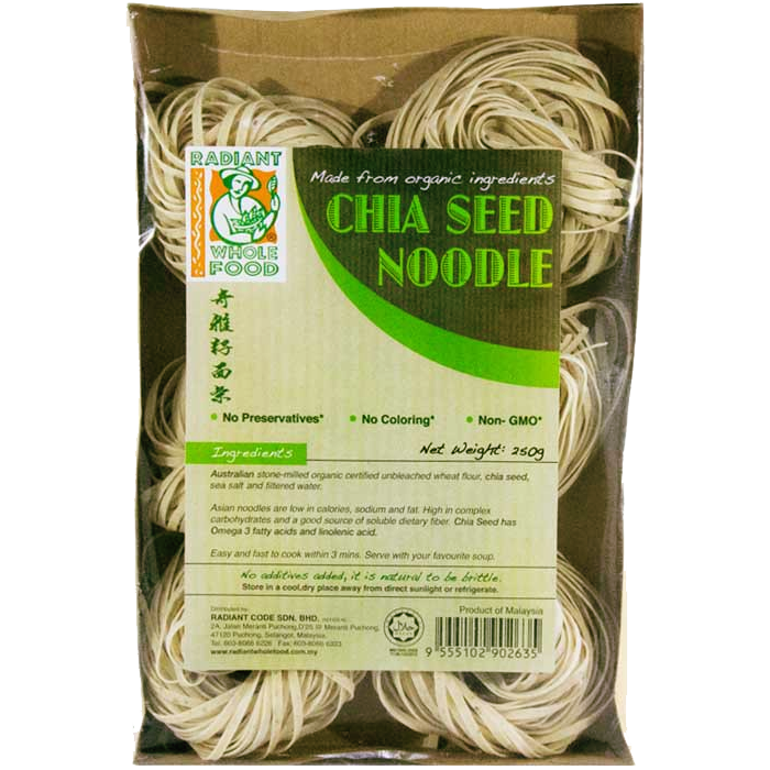 p Asian noodles are low in calories, sodium and fat. HIgh in complex carbohydrates and a good source of soluble dietary fiber. Chia seed has Omega 3 fatty acids and linolenic acid. Easy and fast to cook within 3 mins. Serve with your favourite soup. Ingredients: Australian stone-milled organic certified unbleached wheat flour, chia seed, sea salt and filtered water No Preservatives, No coloring , Non- GMO Net Weight: 250g Product of Malaysia /p