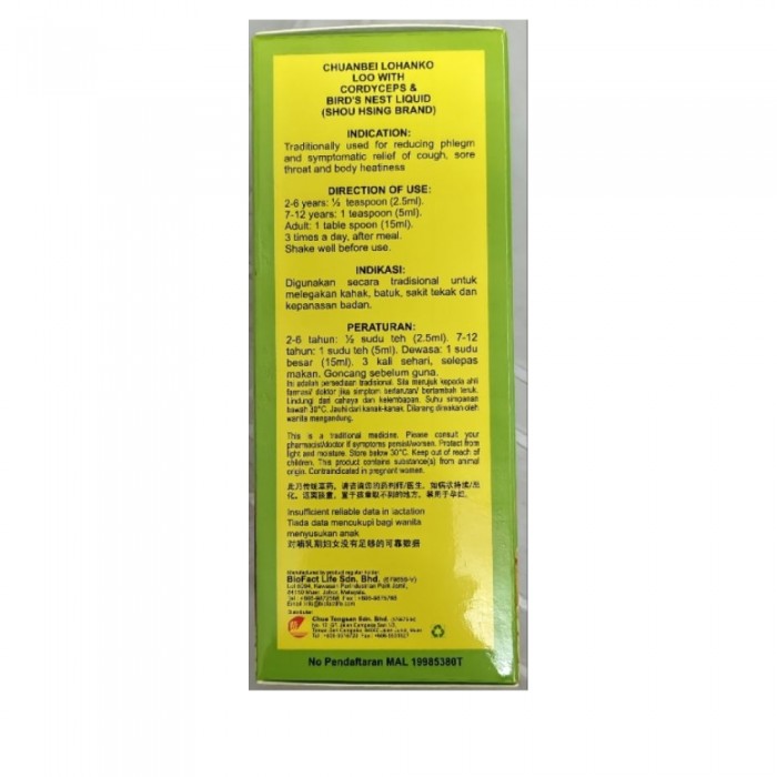 What's in the box: 1 x SHOU HSING Chuanbei Lohanko With Cordyceps & Birds Nest Liquid 120ml - Supplement, Well Being, Health Supplement