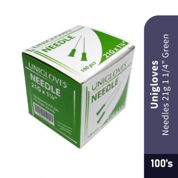 Description: UNIGLOVES 21G needles are high-quality, sterile, and disposable needles designed for a wide range of medical and clinical applications. These needles are 21 gauge, 1-1/4 inches in length, and come in a green color for easy identification. They are suitable for use with BD syringes and other standard syringe types, providing a reliable solution for injections and other medical procedures.
